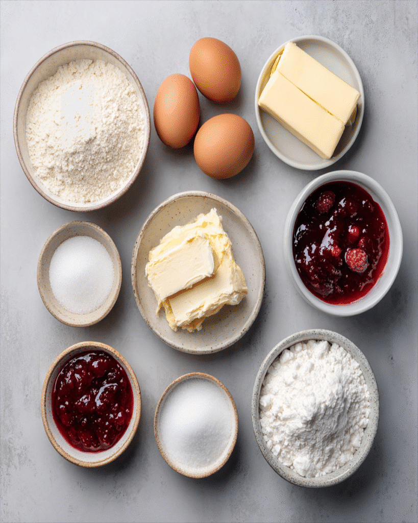 Start with a rich, yeasted dough that includes flour, sugar, eggs, milk, and butter. This dough rises beautifully, creating soft layers that absorb flavor and hold up to the filling. For the inside, you’ll need two things: a sweetened cream cheese mixture and a raspberry filling, either a homemade compote or a high-quality jam.